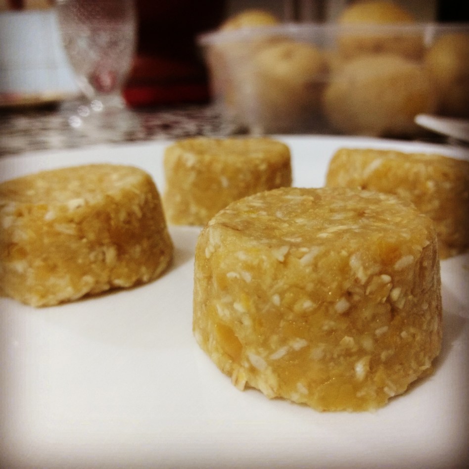 Misturo 200 gramas de grão-de-bico cozido e bem amassado com 30 gramas de coco ralado sem açúcar, 25 gramas de aveia em flocos e 20 gramas de açúcar demerara. Mexo bem e adiciono 50 gramas de banana amassada. Então misturo tudo até a massa ficar maleável. Depois reservo no refrigerador até endurecer um pouco. Para finalizar, fraciono em seis partes e moldo de acordo com a minha preferência. Pronto!