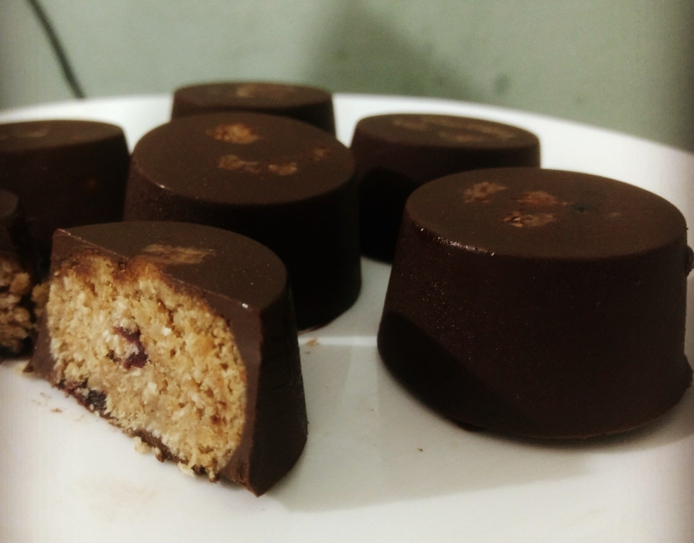 Biscoitos integrais de maisena, pasta de amendoim, coco ralado, cranberry (opcional), leite de coco e chocolate amargo.