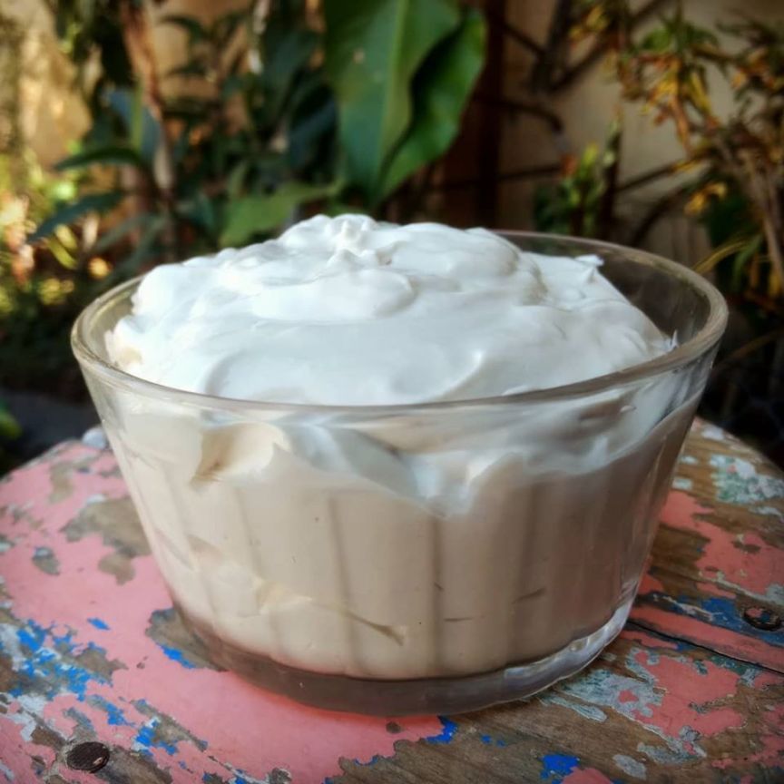 Bato no liquidificador 250 ml de água com 50 gramas de extrato de soja e dois dentes de alho bem picados. Aos poucos, acrescento 200 ml de óleo (use o tipo de sua preferência) e deixo bater até ganhar consistência de maionese. Para finalizar, acrescento sal. É só isso. Dá pra incluir o que quiser também – cheiro verde, páprica, açafrão, etc.