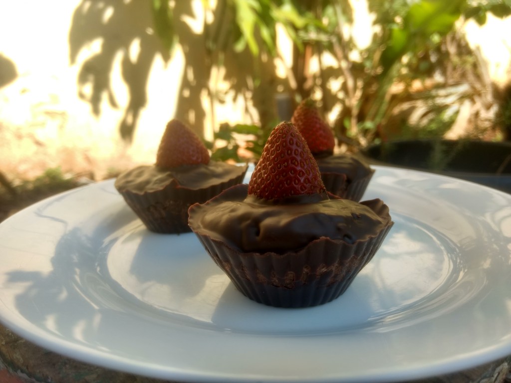 Na sequência, coloco um pouco de massa, cubro com chocolate amargo e acrescento um morango. Repito o processo em mais 14 forminhas. Para finalizar, reservo no refrigerador. Pronto!