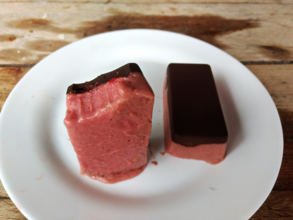 Então derreto 150 gramas de chocolate amargo 70%. Em cada forma, coloco uma primeira camada de chocolate, pequenos pedaços de morango e uma camada da mistura do liquidificador. Repito o processo mais nove vezes ou até acabar a mistura. Para finalizar, reservo no congelador. Pronto!