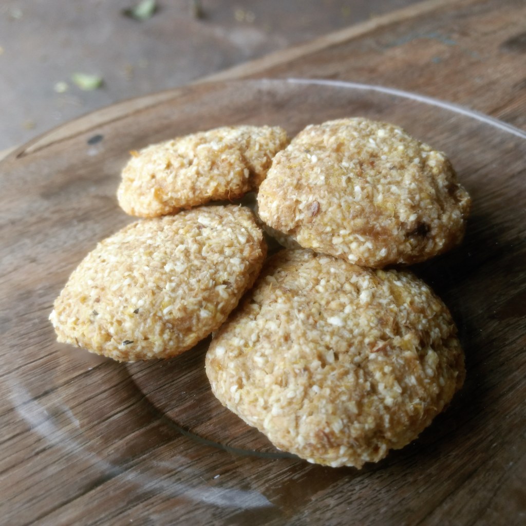 Misturo 120 gramas de resíduos de suco de laranja com 100 gramas de aveia em flocos batida até virar um farináceo (ou farinha de aveia), 30 a 40 gramas de coco ralado sem açúcar, duas colheres de sopa de óleo de coco e 50 gramas de banana bem amassada.