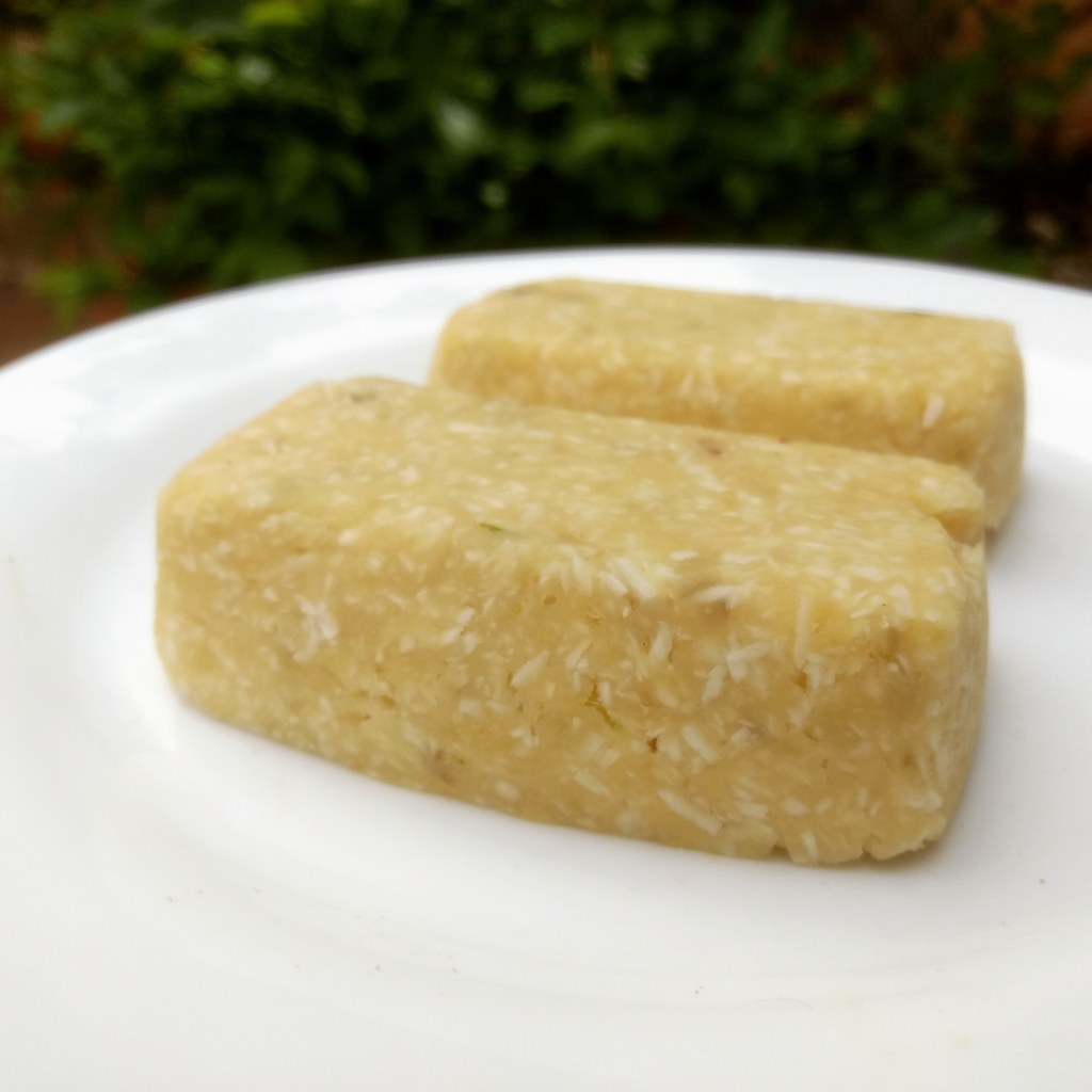 Misturo 150 gramas de batata-doce cozida e amassada com 30 gramas de coco ralado e 1/3 das raspas da casca de uma laranja. Se preferir, acrescente algo para adoçar. Então divido a massa em duas partes e moldo em forma de barra. Para finalizar, reservo no refrigerador. Pronto!
